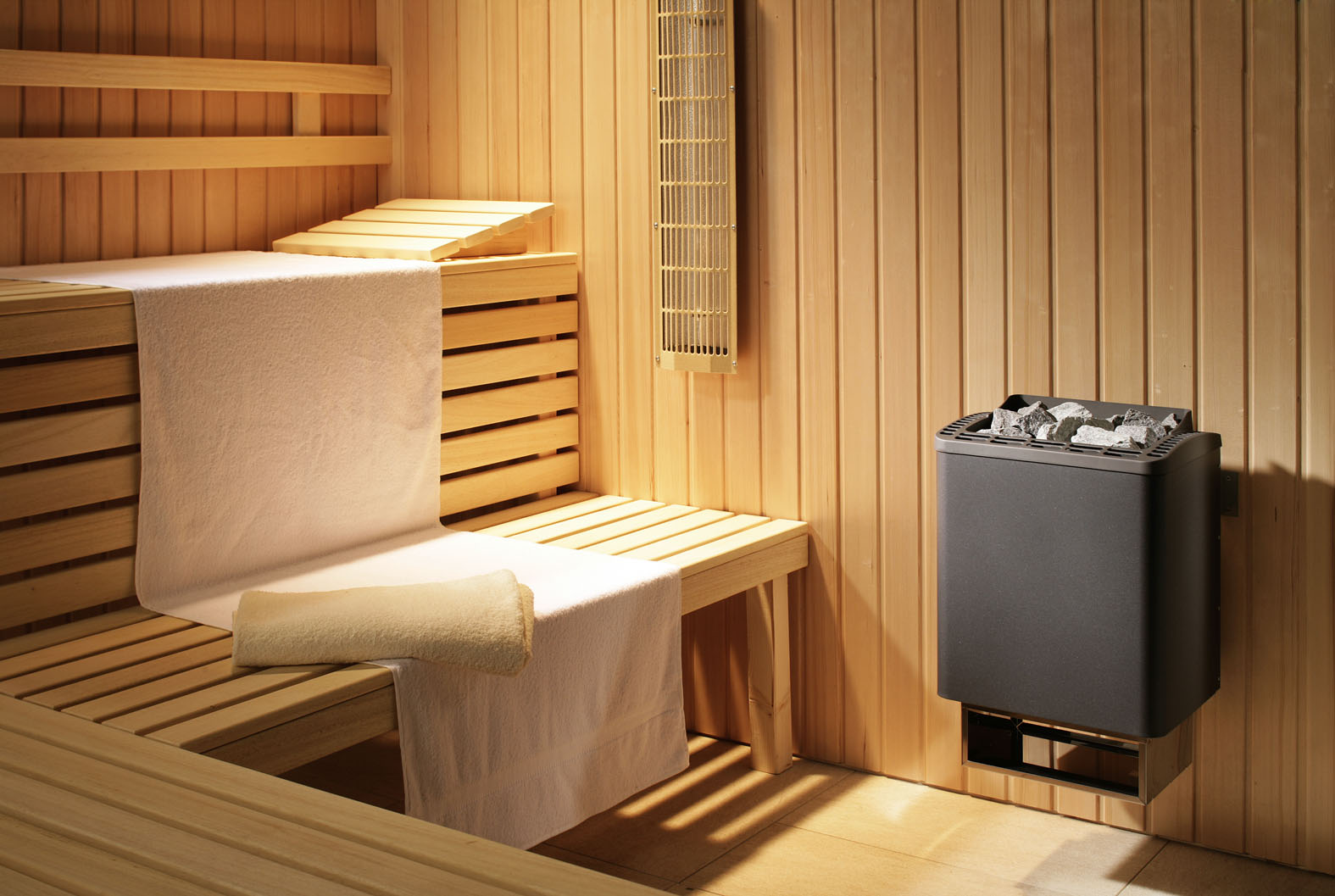 Сауна иначе устроена, в ней изначально поддерживается более высокая температура, от ста градусов и выше. Влажность воздуха в системе достигает своего максимума при отметке в десять процентов. Основной эффект потоотделения достигается за счет попеременного воздействия холодной воды и сухого пара, для чего предусматривается бассейн.